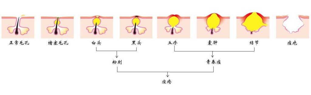 在皮肤上形成粉刺之前,它们一开始都是皮肤下的微粉刺(microcomedones),然后变成粉刺(黑头或白头),最后变成丘疹、囊肿或结节。在净痘的过程中,整个循环会加速把微粉刺推上去表皮层,并促使痤疮的形成。