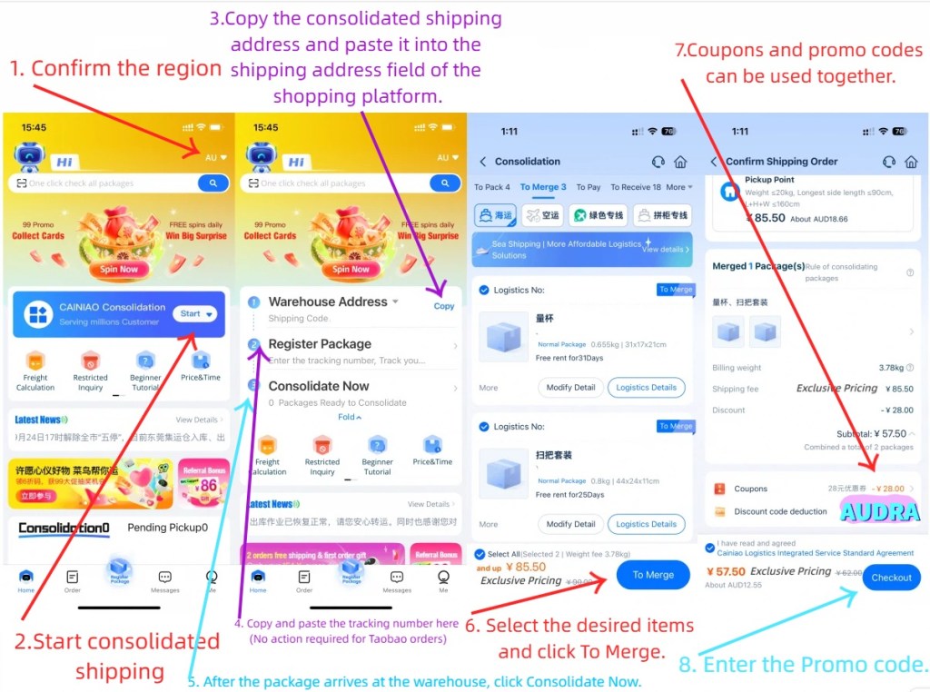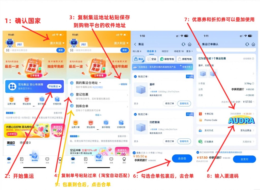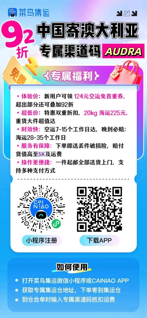 中国直邮/集运澳洲 via 菜鸟,包裹物流状态实时查看!使用 PROMO CODE AUDRA 享有92折优惠